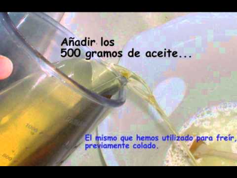 Mi vecina Madalena me comento sí yo tenía aceite usado, que iba a hacer jabón. No tenemos freidora en casa, le dije. Pero ya empeze a leer, poner en practica y a pedir aceite usado. La madre de Floussy, me proporciono 5 litros, acababa de limpiar la freidora. Encontré esta receta, que ha salido muy bien.
